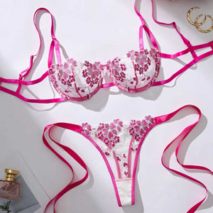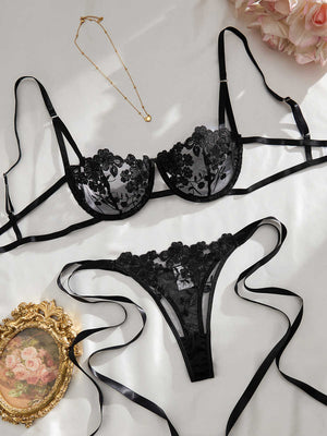 Make every moment feel special with this two‑piece bra and panty set. Sheer floral embroidery, satin bows, and slim straps frame your curves, while underwire cups, soft stretch fabric, and adjustable straps give lift and a comfy, custom fit you can wear all night.