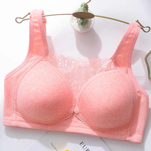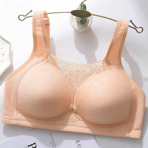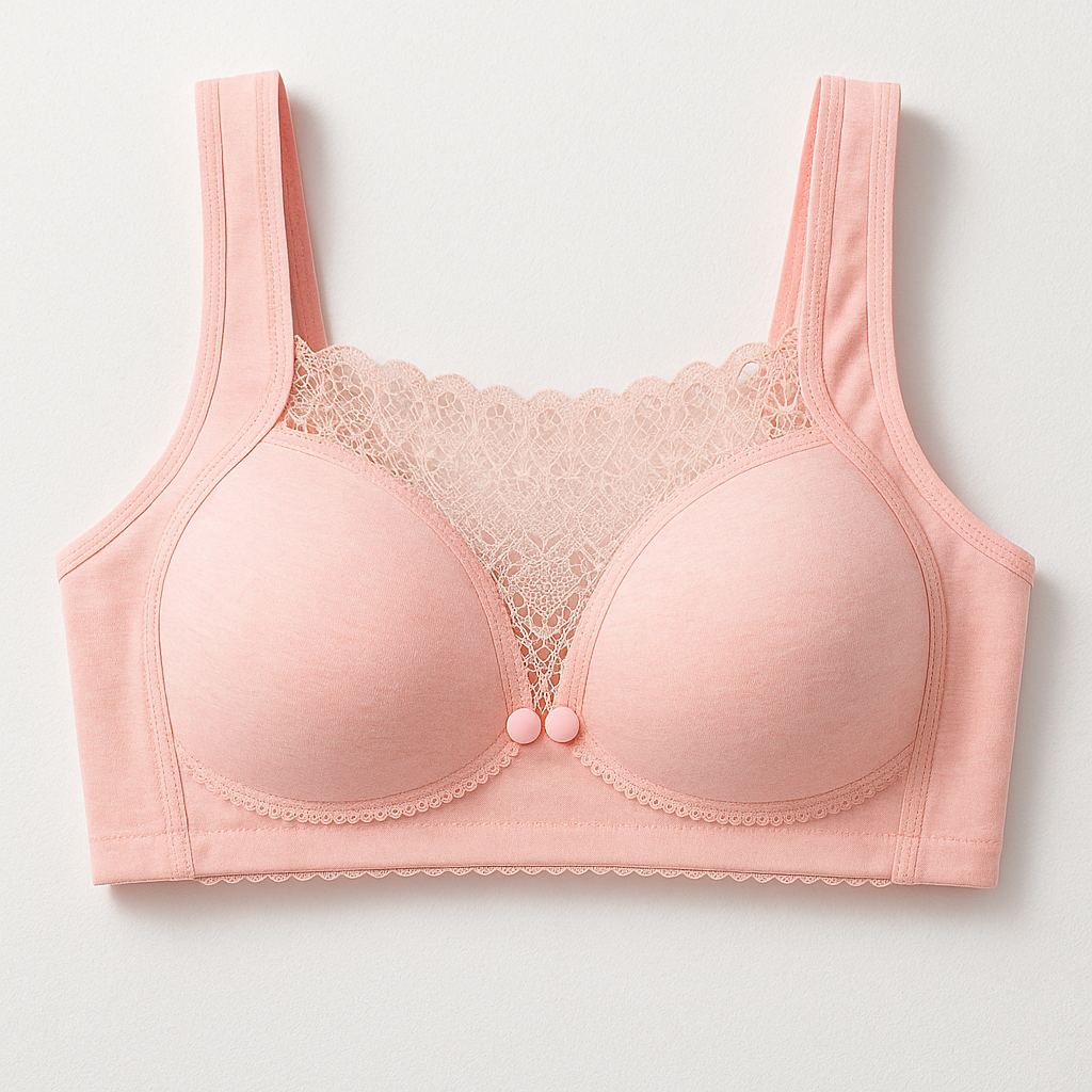 Feel beautiful and supported from sunrise to bedtime. This wireless nursing bra is soft cotton‑ stretched with smooth cups that gently lift, plus a sweet lace panel that looks pretty under low tops. Front‑open snaps make feeding or pumping quick with one hand, while wide straps and a smooth band keep you comfy all day.